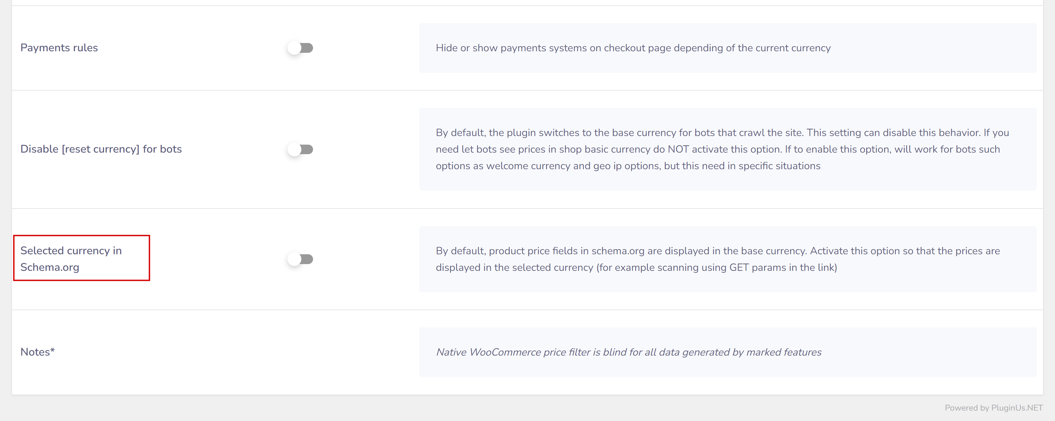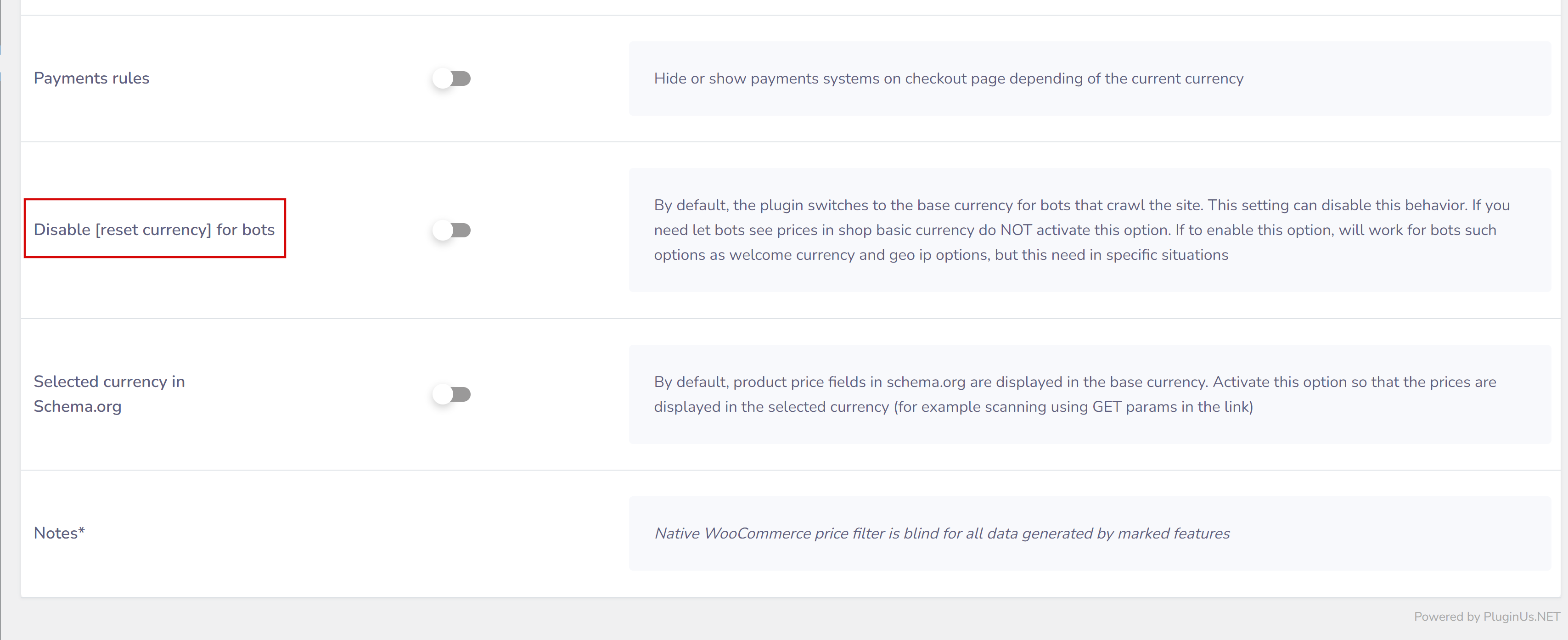 - new advanced option “Disable [Reset currency] for bots”: By default, the plugin switches to the base currency for bots that crawl the site. This setting can disable this behavior. If you need let bots see prices in shop basic currency do NOT activate this option. If to enable this option, will work for bots such options as welcome currency and geo ip options, but this need in specific situations